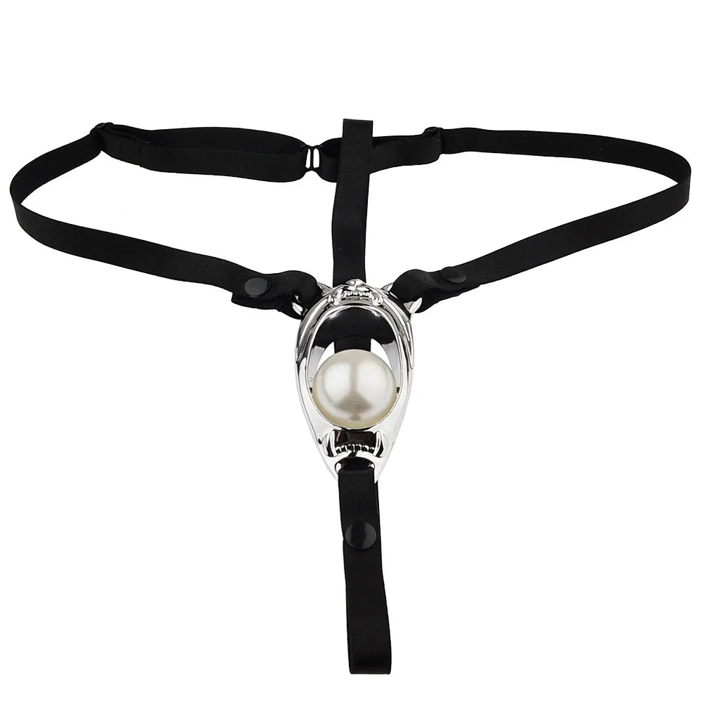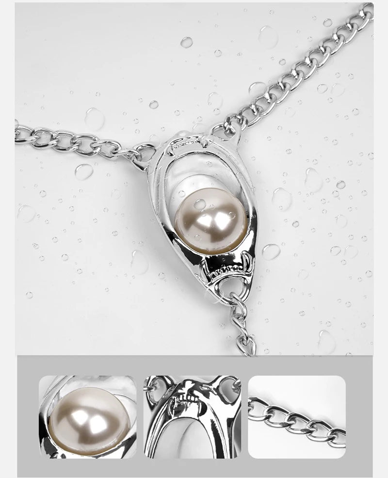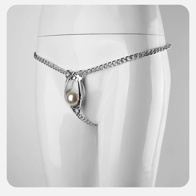 This captivating belt features dual waist chains connected by a single front-to-back chain, secured at the small of your back with a padlock for ultimate control. A stunning freshwater pearl, nestled in an intricately designed steel setting, adorns the front, symbolizing beauty and protection over your most intimate area.